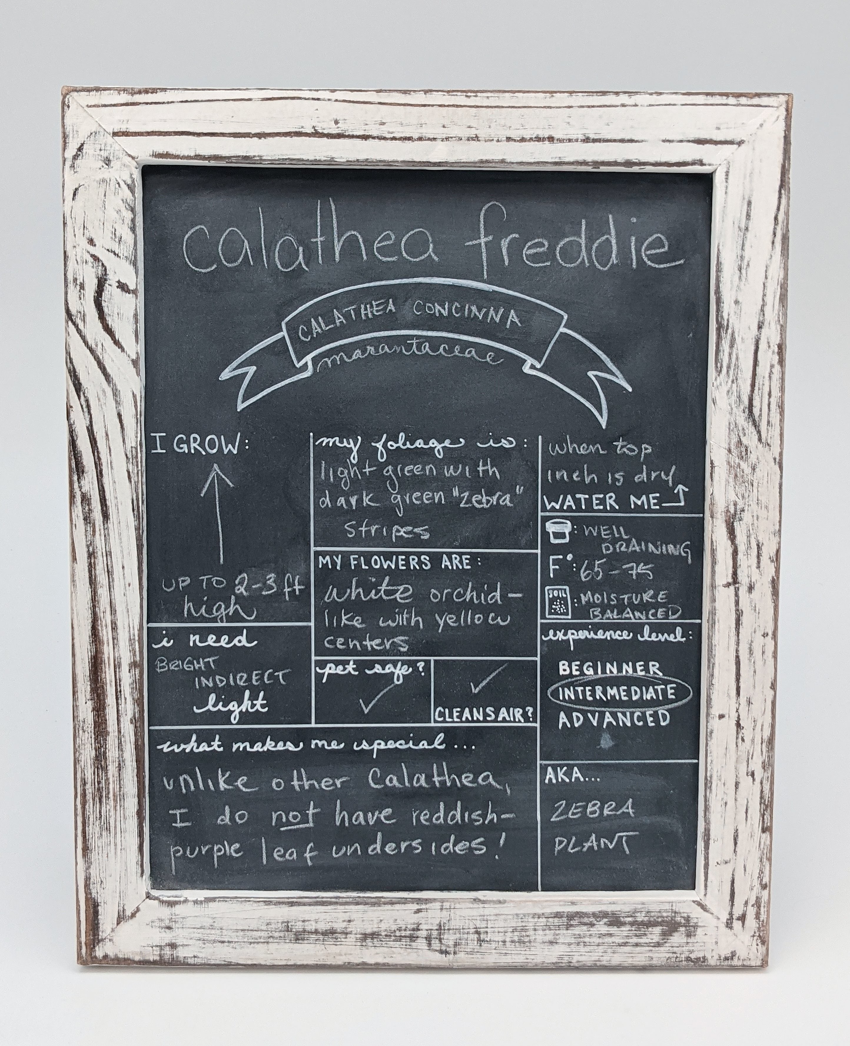 The Calathea family is vast and contains around 300 different kinds of Calathea! This blog will cover Calathea Freddie, or Calathea Concinna. Freddie’s foliage is the same general shape and size of other Calathea plants. Freddie’s foliage coloring starts with bright green and is overlaid with darker green zebra-like stripes and edging in the same shade. One thing that helps Freddie to stand out from other Calathea plants is its lack of reddish-purple undersides. When other Calathea plants fold up their leaves at night, they show off that rosey underleaf. Freddie is also more likely than other Calathea plants to develop flowers when grown indoors.