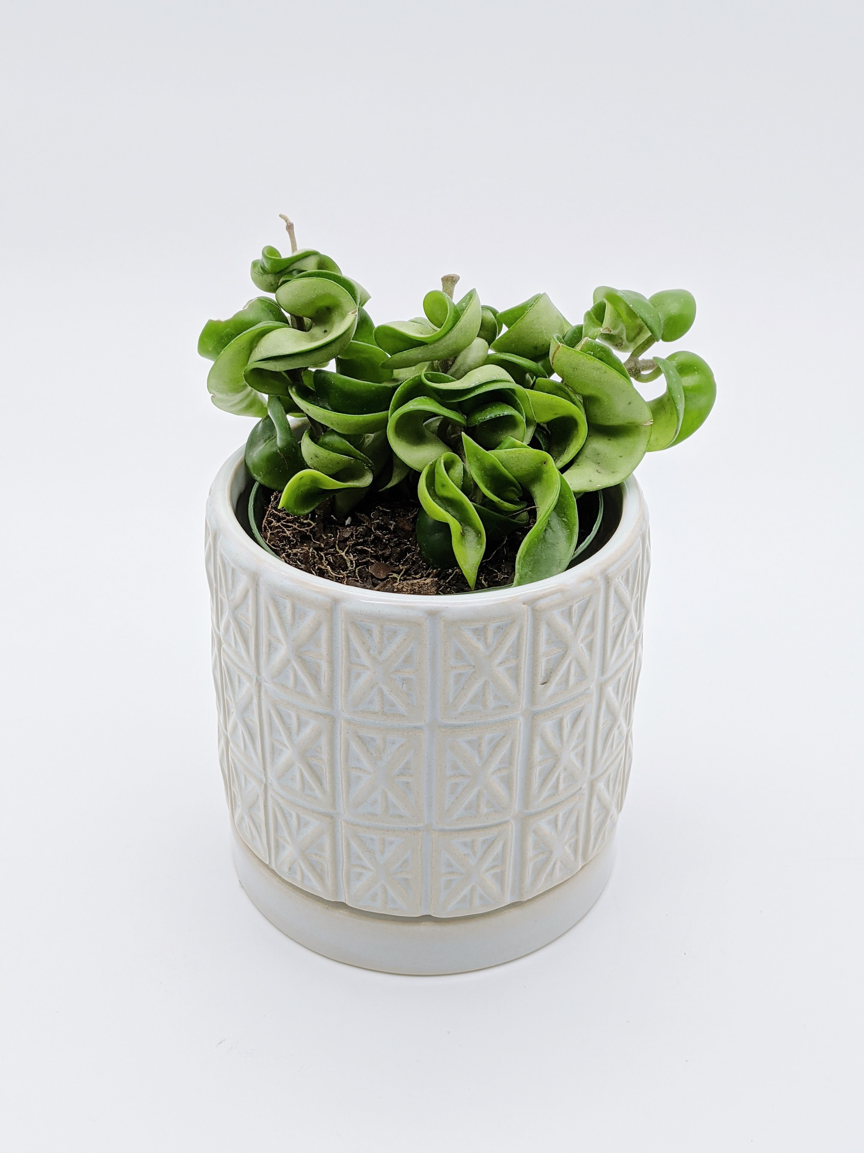 Plant Hoya Hindu Rope in a smallish pot as it prefers to be slightly root bound, and is even known to be more likely to bloom if its roots are nice and snug. Use a lightweight and very well-draining soil. Remember, these plants would simply grab onto a tree or another plant with their roots in the wild. Water Hindu Hoya Rope when the soil is completely dry to the touch. You can also use the “squish test” with this semi-succulent to see if the plant needs water. (Succulents store their water in their leaves rather than drinking it only from the soil as they need it, so if the leaves are soft and give when you gently squish them, they are no longer full of water and could probably use some.) When watering Hoya Hindu Rope, drench the plant with running water for a few minutes and then make sure it’s not sitting in any standing water before you put it back in its home. If your pot doesn’t have any drainage, take extra care to not over-water, and use a Moisture Meter to see if the soil at the bottom of the pot is dry.