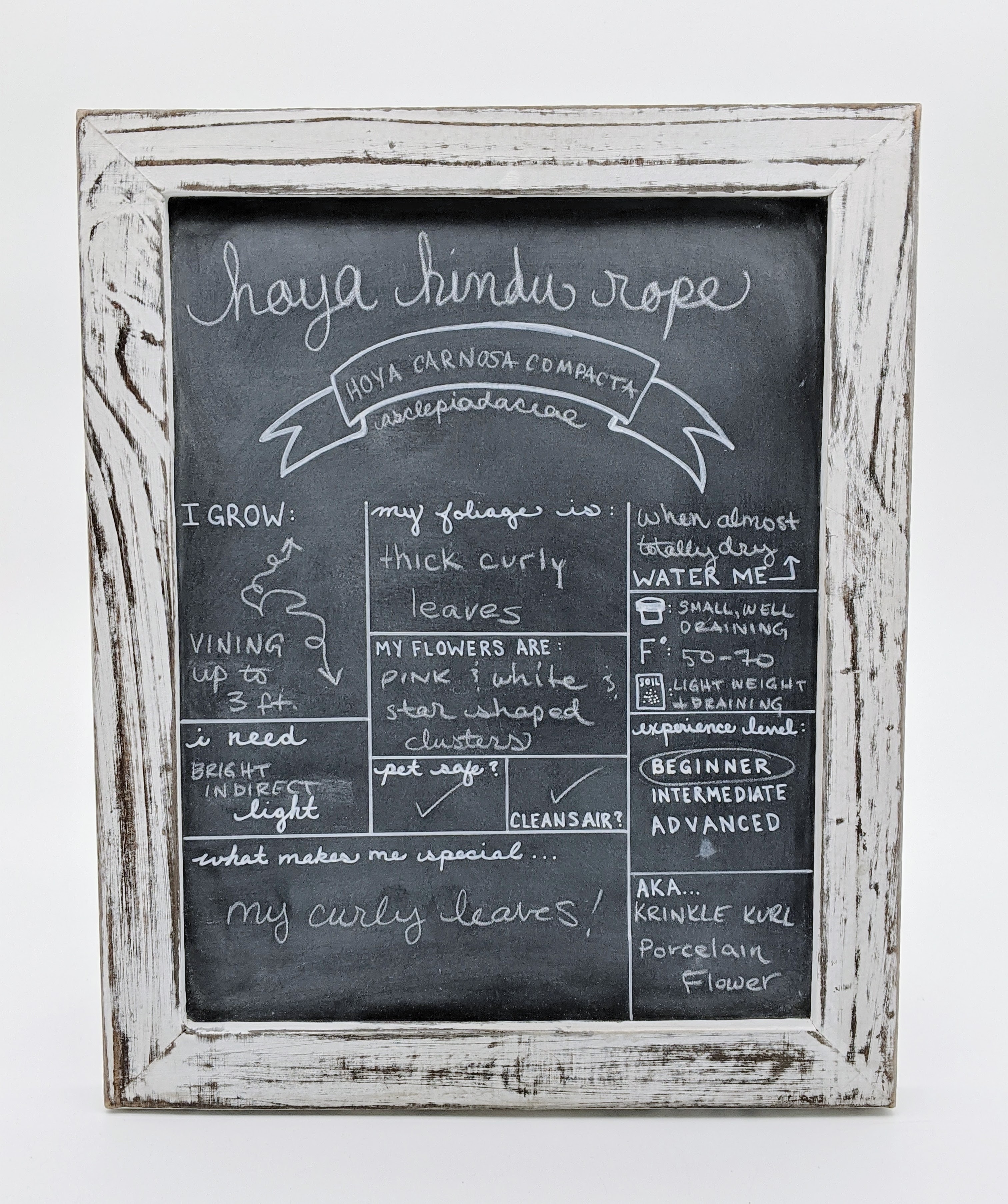 Hoya Hindu Rope is an epiphytic semi-succulent with very curiously shaped leaves and incredible clusters of pink and white star-shaped flowers. Native to East Asia and Australia, the Hoya Hindu Rope (or Hoya Carnosa Compacta) is both drought-tolerant and humidity-friendly. The succulent aspect of the plant enjoys dry soil and stores its water in its leaves like other succulents. Keep its roots dry to avoid root rot! The epiphytic (air plant) aspect of the plant likes to absorb some of its moisture through its leaves, so it appreciates some humidity (think a humidifier, tray of pebbles and water, or misting).