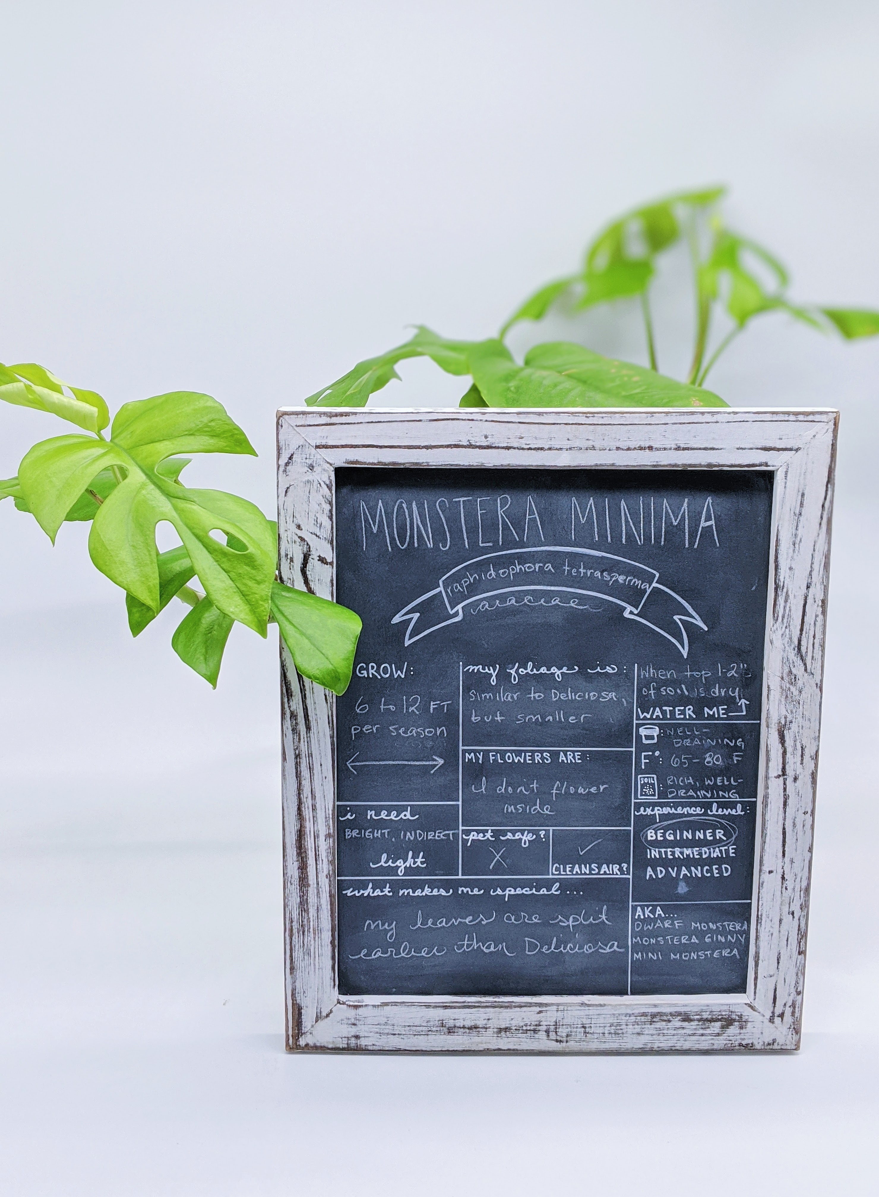 Monstera Mimina likes bright, indirect light and will tolerate some lower light. Plant Monstera Minima in well-draining soil with plenty of aeration, and plant it in a pot that also has plenty of drainage. As with most houseplants, Monstera Minima does not like for its roots to sit in wet soil. If your pot does not have a drainage hole, we recommend a moisture meter that will help you test the moisture level at the bottom of the pot before watering. In general, you’ll want to let the first inch or so of soil dry out before watering, but don’t let the soil get completely dry.