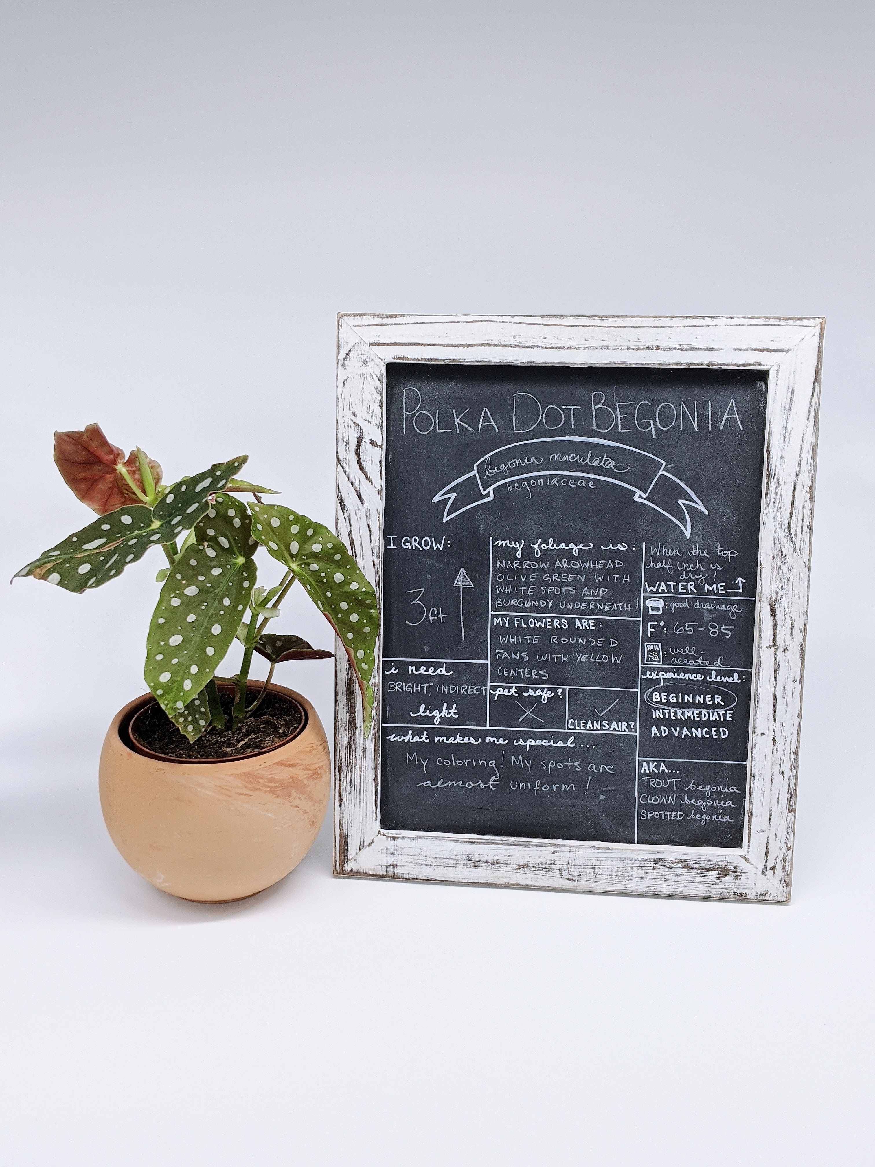 Polka Dot Begonia can tolerate higher levels of light, but be prepared for accelerated growth with more frequent waterings and fertilizer. If you notice a loss of color in the leaves followed by yellowing and ultimately the loss of the leaf, try moving it into more sun. Yellow leaves are also a common sign of overwatering, so make sure your plant is not sitting in water. Moisture Meters are a great way to test the bottom of the pot to make sure it’s not saturated (which can cause root rot in most houseplants). Crispy, brown spots on the leaves can indicate that the plant is getting too much sun.