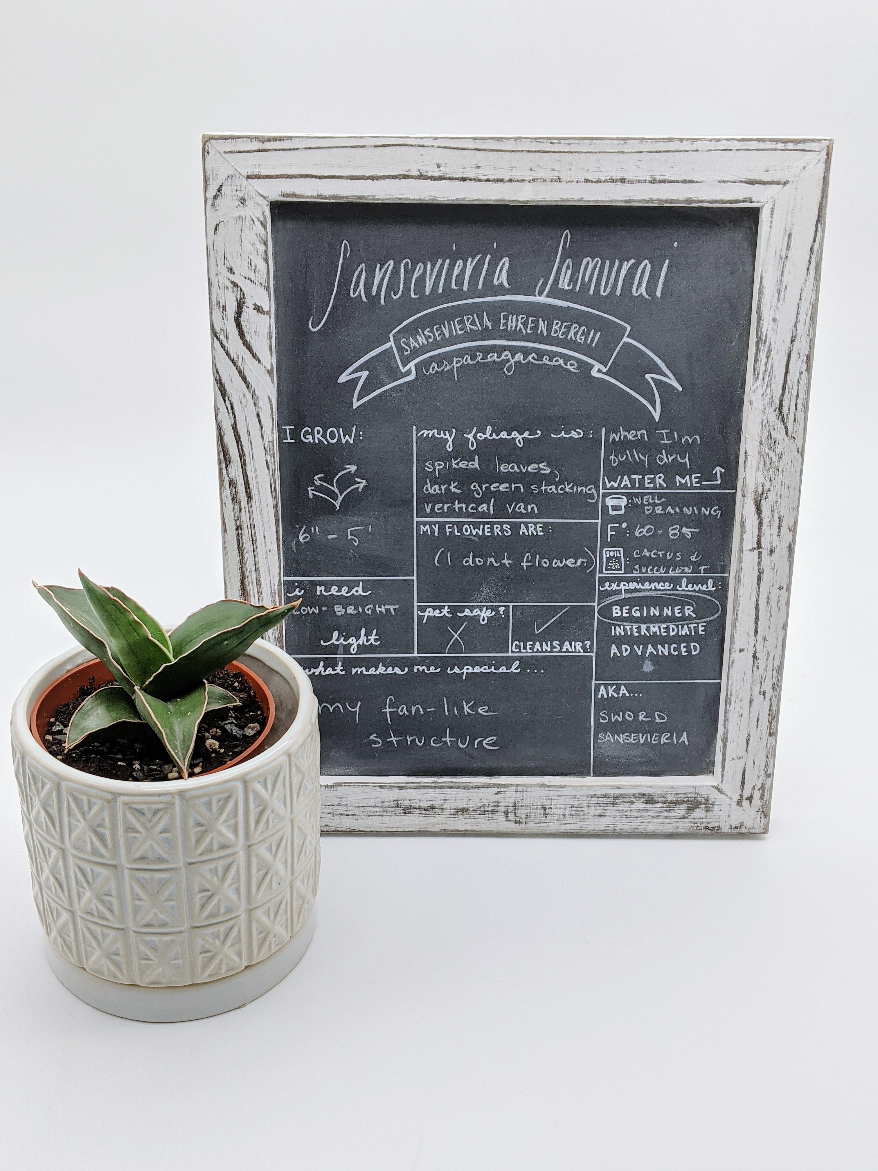 Sansevieria Samurai is an easy to grow succulent that asks little and takes up little space. What makes this plant special is the way its spiked leaves grow in a spiraling fan-shaped manner. While most Sansevieria (think of plants you might know as “Mother in Law’s Tongue” or “Snake Plant”) grow with their thin, sword shaped leaves pointing up to the sky, this particular Sansevieria has thicker and shorter leaves that grow out toward the edges of the pot, and stack on top of each other. From the top they look like a spiral, and from the top they look like a fan.