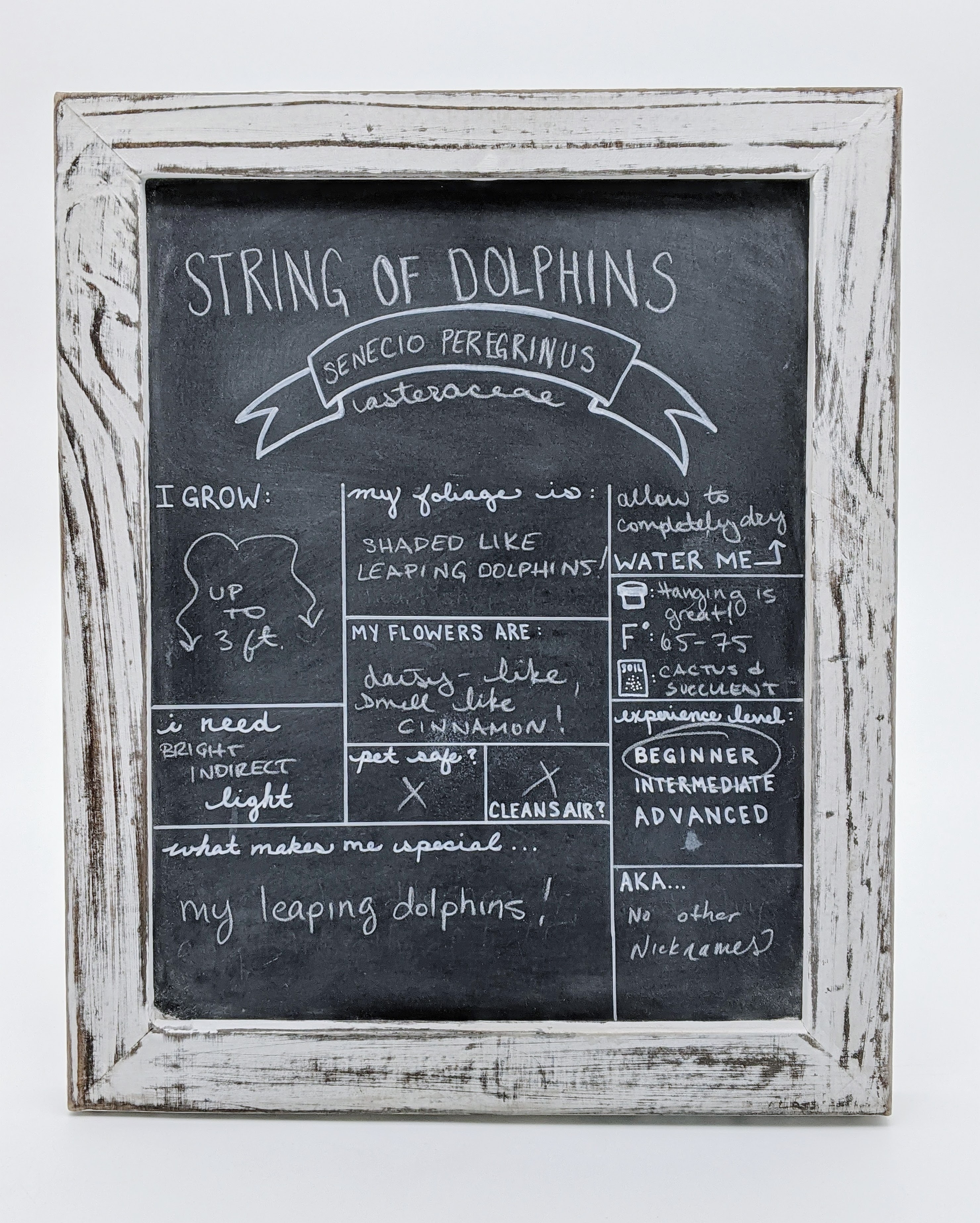 String of Dolphins might be the cutest succulent in existence. This plant, whose scientific name is Senecio peregrinus, has leaves that are shaped like little dolphins leaping out of the water. These little dolphins grow on trailing vines like other “String of” plants such as hearts, bananas, turtles, pearls, etc. String of Dolphins is actually bred from the cross-pollination of Senecio Rowleyanus (String of Pearls) and Senecio Articulatus (hot dog cactus)These vines can grow to be around three feet long, and look wonderful spilling out of a hanging basket or trickling down over bookshelves or the edge of a stair rail. Part of the Asteraceae family, the flowers that grow from String of Dolphin plants (when the plants are very happy and in just the right conditions) are daisy-ish and are said to smell like cinnamon.