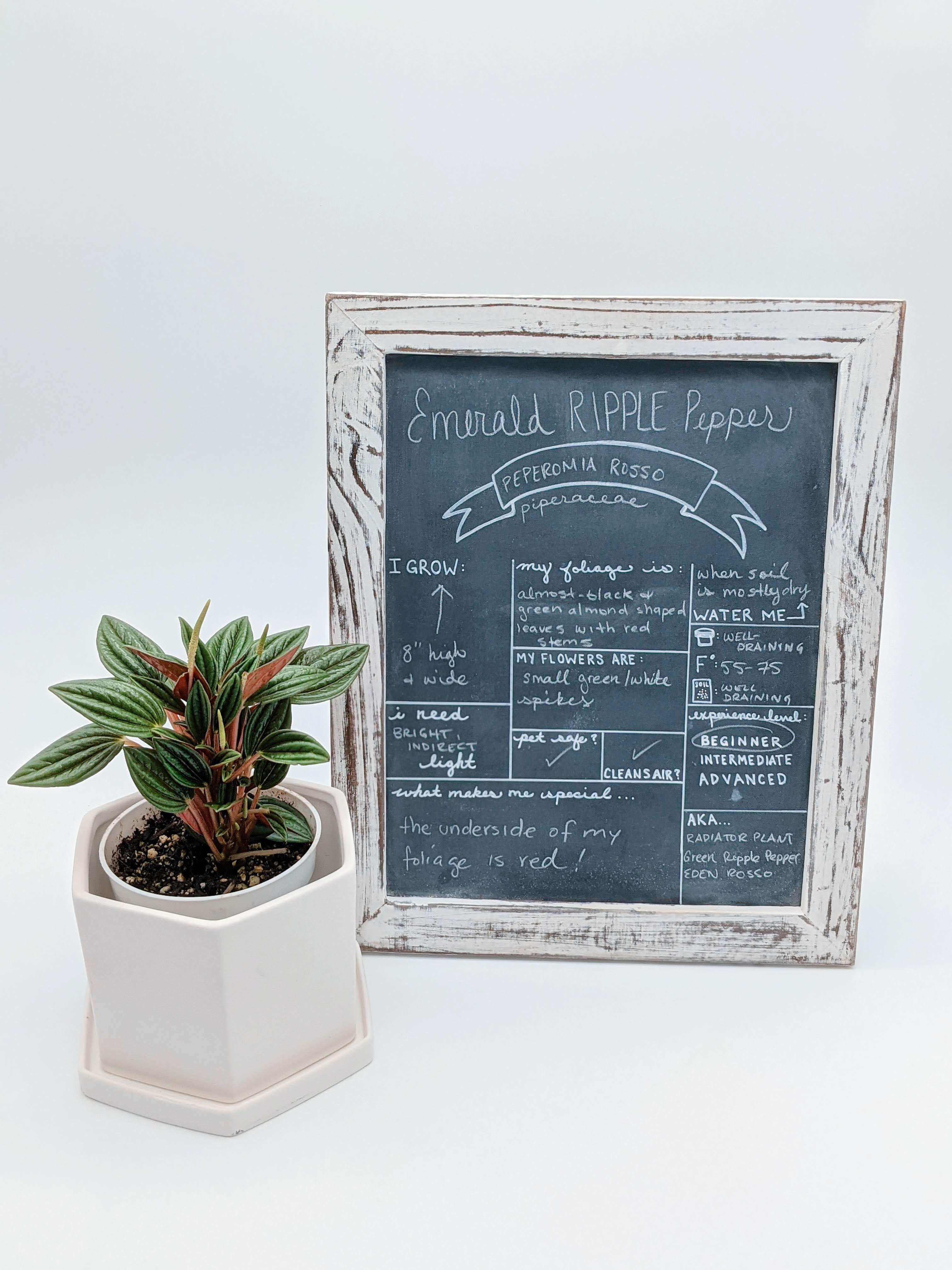 Peperomia Rosso comes from the Piperaceae family which is, you guessed it, the Pepper family! It is a compact little houseplant that can grow to be about 8 inches wide and high in general. It has similar coloring to many other peperomia (but you definitely still need *all* the peperomia) with its red stems and green leaves with nearly-black dark green grooves. The leaves are textured, giving them a look that’s worth a double-take. The flowers of Peperomia Rosso, like other Peperomia, are more like long spikes than typical petal-bearing flowers. They are generally mostly white and can have some green on the tips of the 2-3 inch spikes.