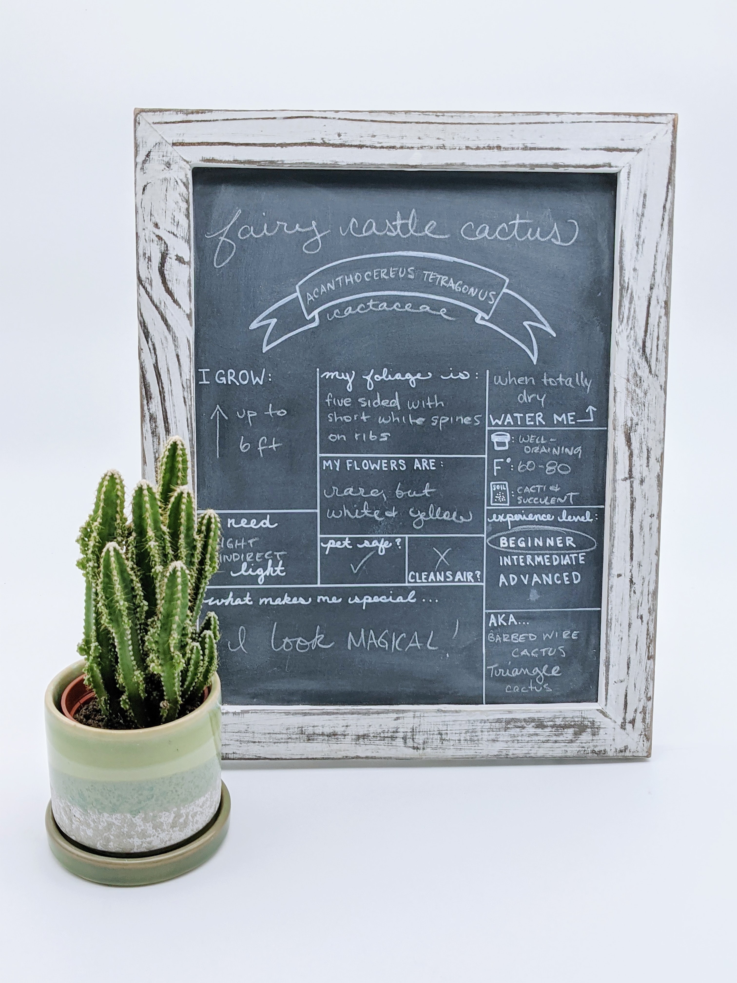 Fairy Castle Cactus looks just like it sounds. This delicate cactus, Acanthocereus Tetragonus (formerly Cereus Tetragonus), grows vertical stalks close together, and turret-like arms grow off of these “towers.” These towers and turrets are five-sided. The ribs are packed with tiny white thorns. It is also commonly known as Barbed Wire Cactus, Triangle Cactus, Night-blooming Cereus, and Sword Pear. It’s a great plant for beginners as cacti are very forgiving and drought tolerant.