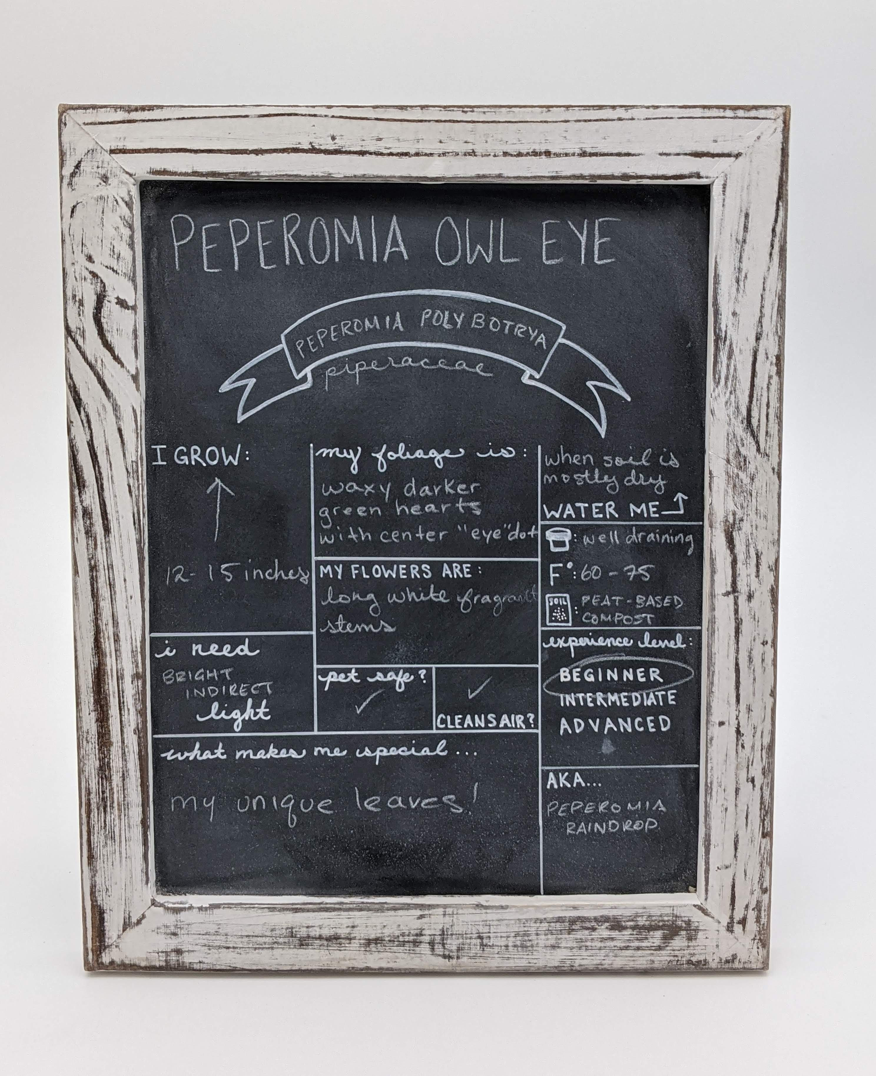 Most of the attributes shared by the Peperomia family are the same for Owl Eye Peperomia, which comes originally from Columbia and Peru. This plant is pet safe, cleans the air, likes bright, indirect light and will thrive in fluorescent light, should be allowed to mostly dry in between waterings, and as a result can be placed just about anywhere! It does like a bit of humidity, so a tray filled with pebbles and water for the plant pot to sit on top of, or a humidifier nearby, could be helpful to encourage the plant to thrive. Owl Eye Peperomia will do best with a well-draining soil, such as a peat-based compost or similar.