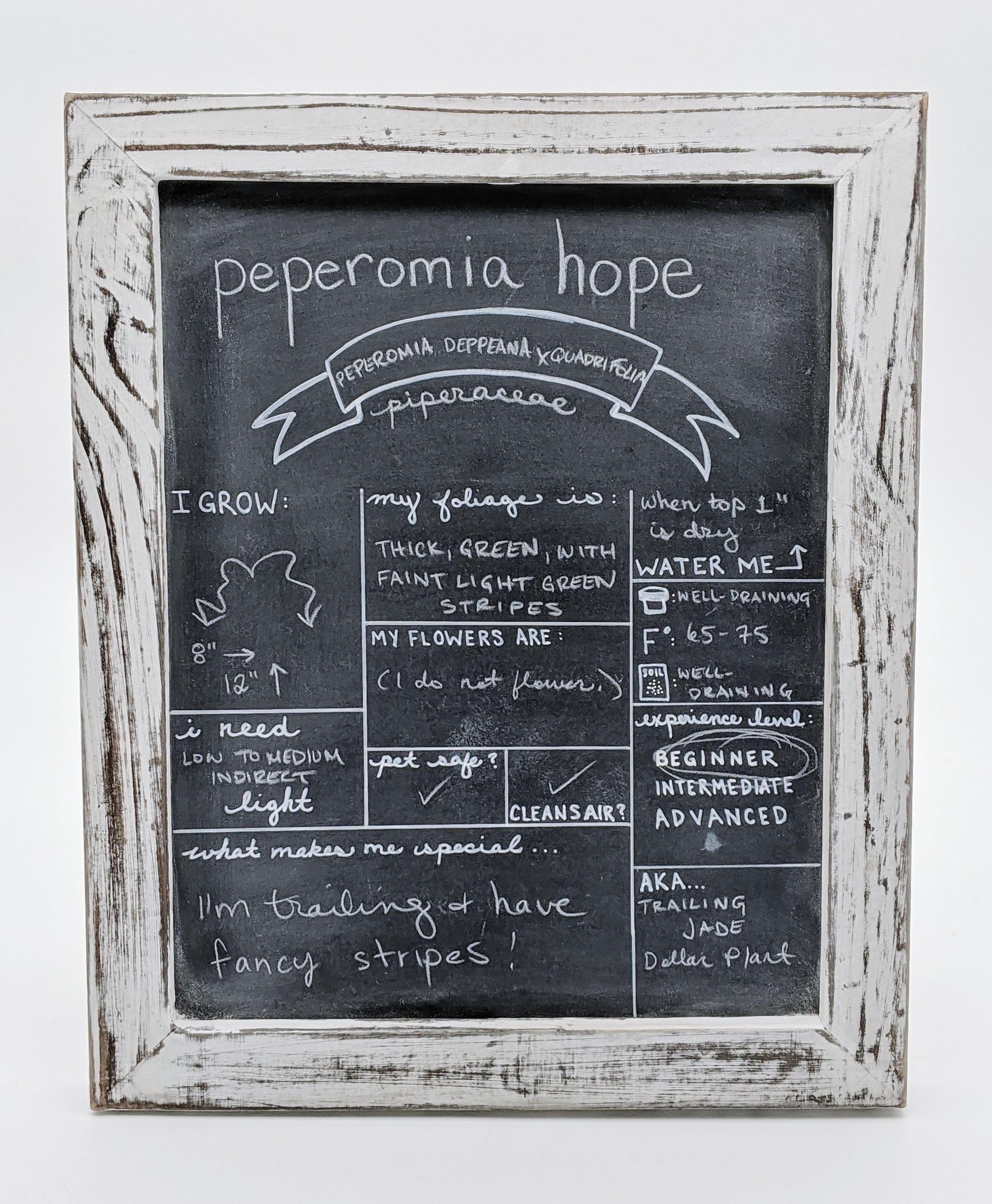 Its thick foliage grows on a long trailing vine, and is coin shaped and bright green with faint light green stripes. Peperomia Hope will not flower, but its attractive foliage makes up for the lack of flowers. Like other trailing vines, it can be trained up walls, across ceilings, or around stair rails. The young vines will first grow up, and then with time, flop over and begin to trail.