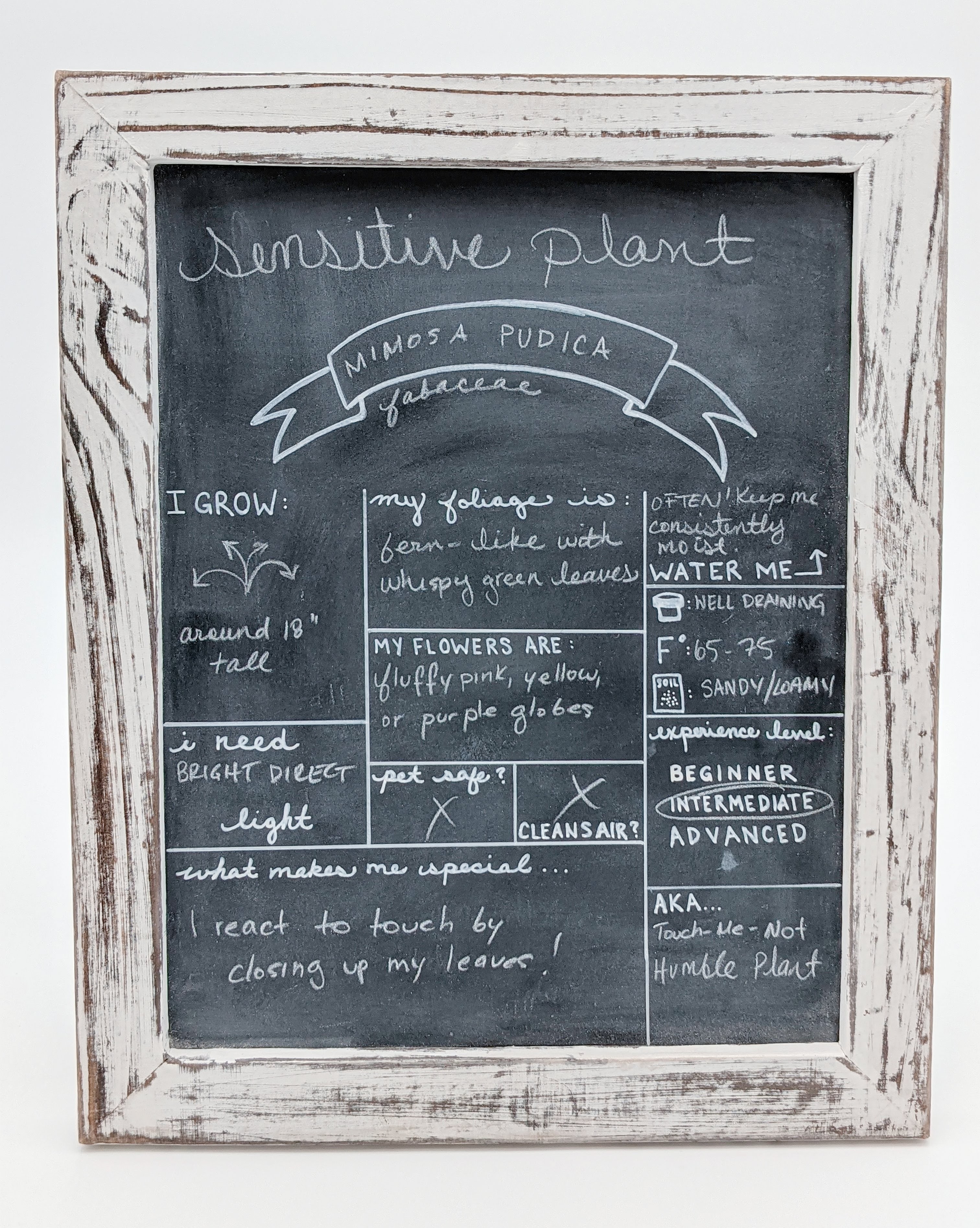 Sensitive Plant is not pet safe, and it is not air cleaning. It has sharp spines on its stems, so it’s best to keep out of reach of tiny human hands as well. Because it likes humidity and to be consistently moist, Sensitive Plant would work great under a cloche and could be a very beautiful statement piece! It would also be a great plant for a terrarium as a terrarium would also facilitate the constant temperature, humidity, and soil moisture levels that Sensitive Plant needs. If Sensitive Plant is placed under a cloche or in a terrarium, care for the plant should be fairly simple, but if the plant is placed on its own, we rate it as a plant best kept by intermediate level Plant Parents and those who will be able to keep up with its watering, lighting, and humidity needs.