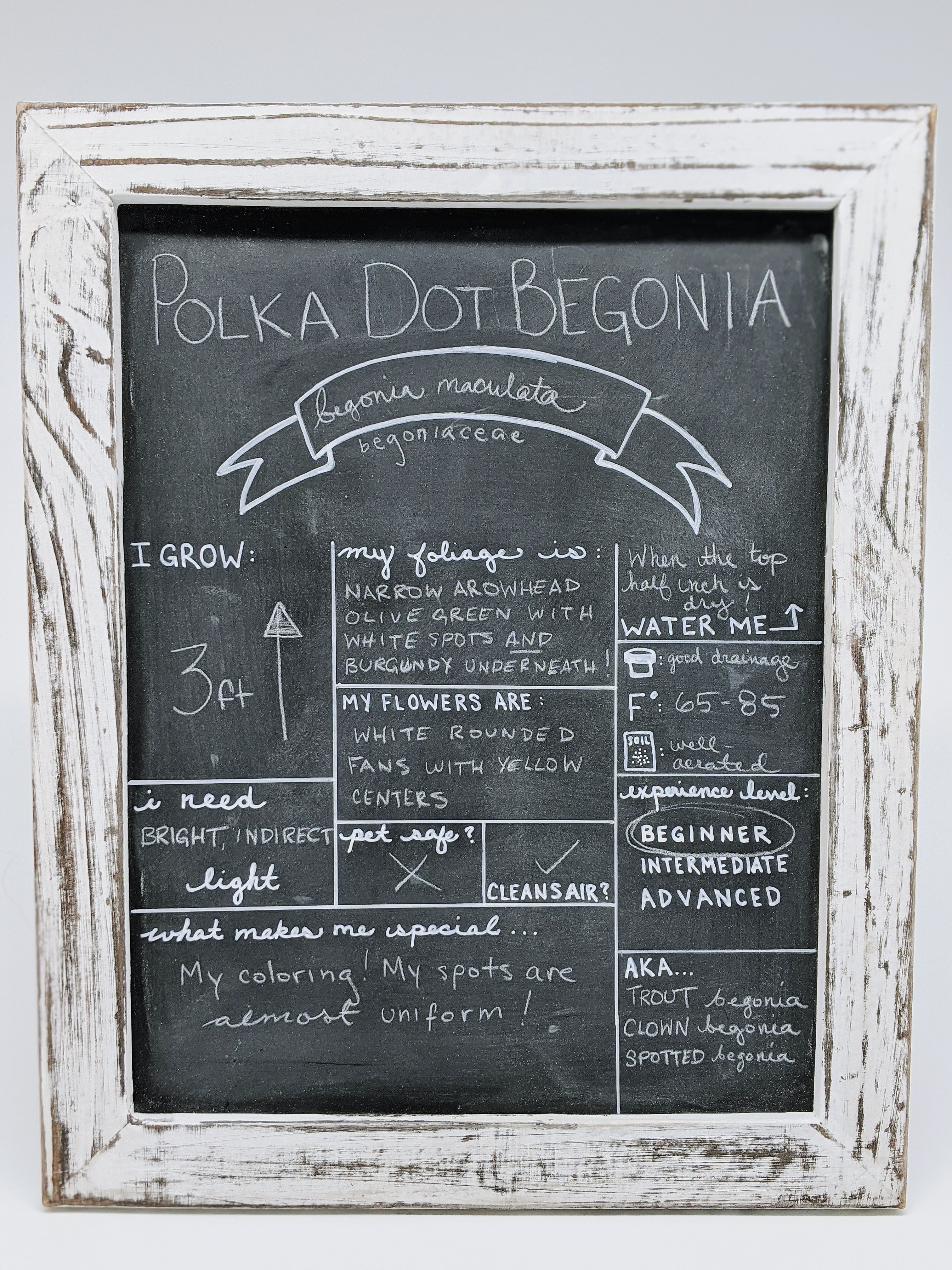 Polka Dot Begonia can tolerate higher levels of light, but be prepared for accelerated growth with more frequent waterings and fertilizer. If you notice a loss of color in the leaves followed by yellowing and ultimately the loss of the leaf, try moving it into more sun. Yellow leaves are also a common sign of overwatering, so make sure your plant is not sitting in water. Moisture Meters are a great way to test the bottom of the pot to make sure it’s not saturated (which can cause root rot in most houseplants). Crispy, brown spots on the leaves can indicate that the plant is getting too much sun.