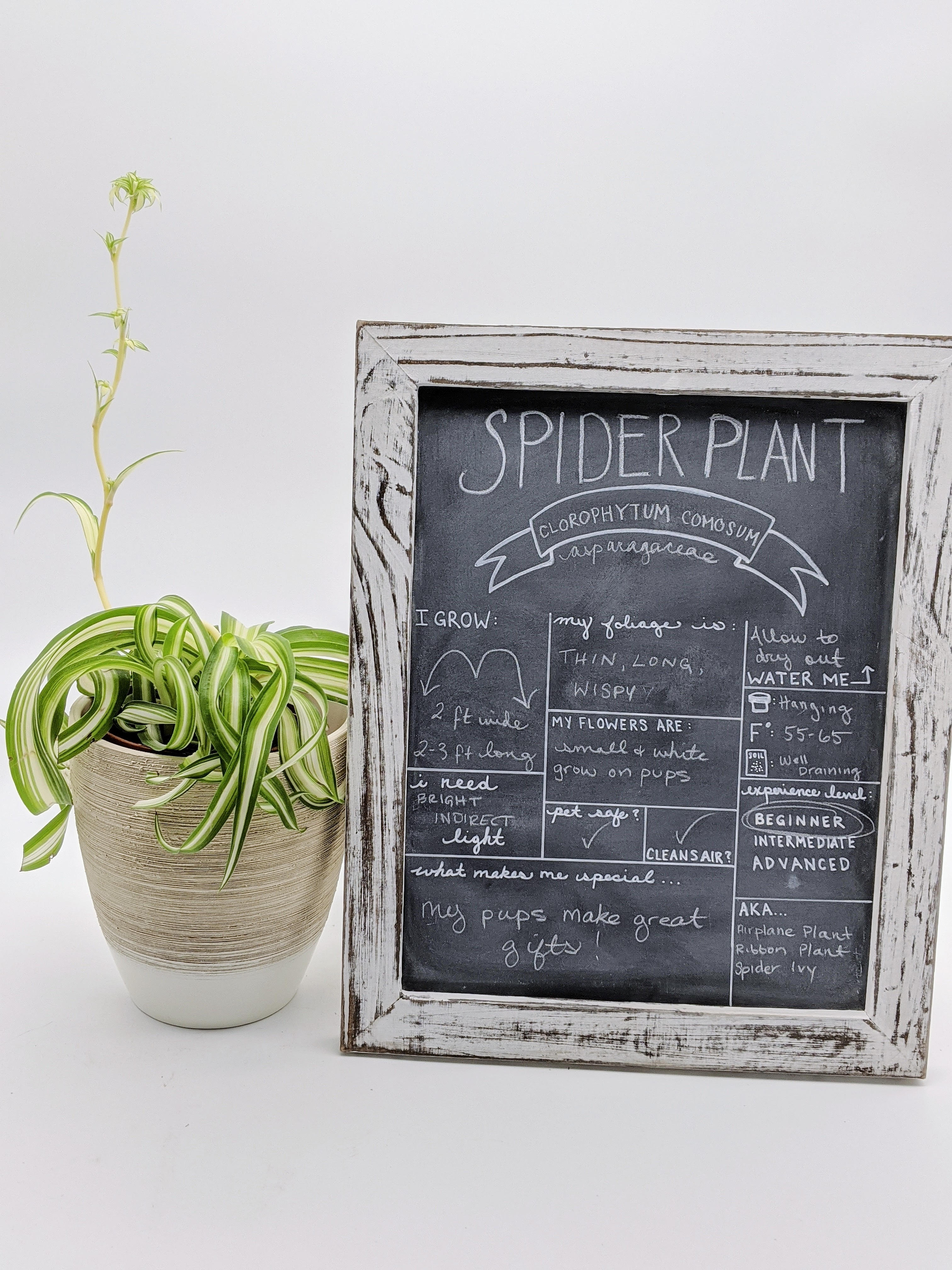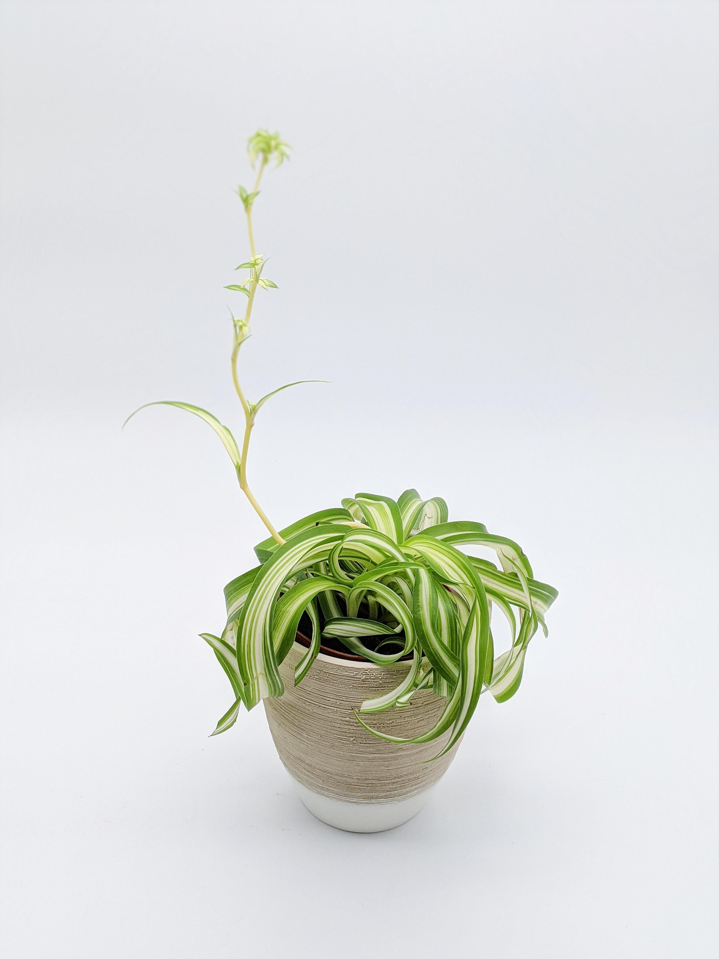 Spider Plant gets its common name from its wispy, long, and cascading foliage. It’s official name is Chlorophytum comosum, and it belongs to the Asparagaceae family. It’s also commonly known as Ribbon Plant, Airplane Plant, or Spider Ivy. A native to tropical environments, Spider Plants like humidity and will perform best with a little added moisture here in Colorado. If your Spider Plant has brown edges or tips on its leaves, it could be a sign that the plant needs more water. Spider Plant is sensitive to fluoride in our water (it can cause a salt buildup in the soil), and brown tips could also be an indication that it’s getting too much of that fluoride. Leave water out for 48 hours to allow the fluoride to dissipate, or use distilled or rain water. Allow the soil to dry out between waterings, then give Spider Plant a nice long drink, allowing the water to run through the drainage holes at the bottom of your pot. If your pot does not have drainage holes, take care when watering, and use a Moisture Meter to determine the moisture level at the bottom of the pot before watering.