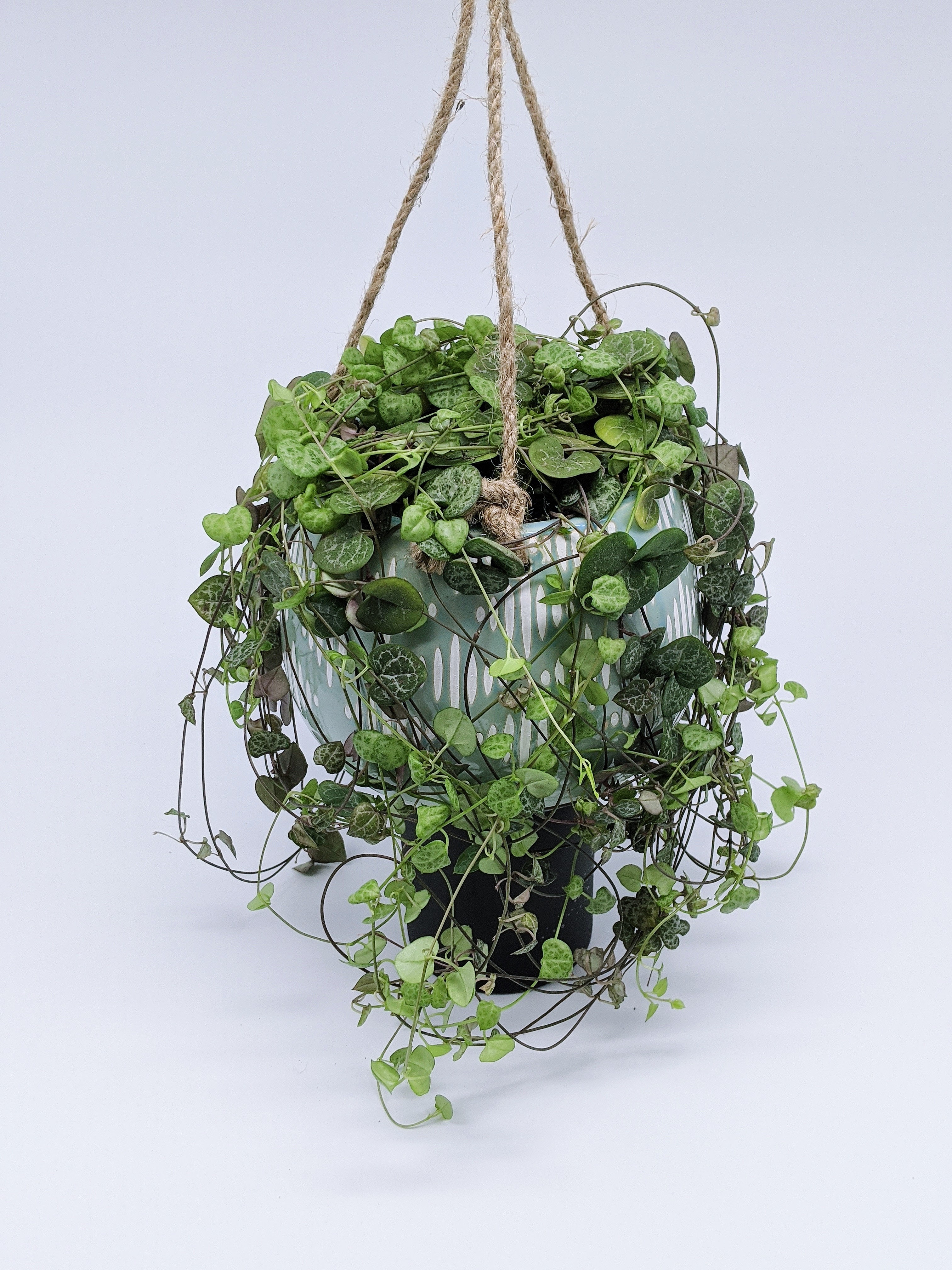 “String of” plants are some of the most fun and easy plants to grow – as long as you give them plenty of neglect! These plants are considered to be “semi succulents,” as they store some of their water in their “leaves,” but they also have a rhizomatous root system that also stores water. For this reason, these “String of” plants need very little water. As with most succulents, you want to let the soil dry out between watering, and you can also use the “leaves” as a guide. If they are firm, that means they are full of water and not in need of any extra. If they have become a little squishy, and the soil is dry, they are ready for a drink. Just water the plant until water begins to seep out the bottom of the pot. If your pot does not have a drainage hole, take extra care when watering, and err on the side of too little water. Succulents and Semi Succulents are very susceptible to root rot, which is caused by over watering.