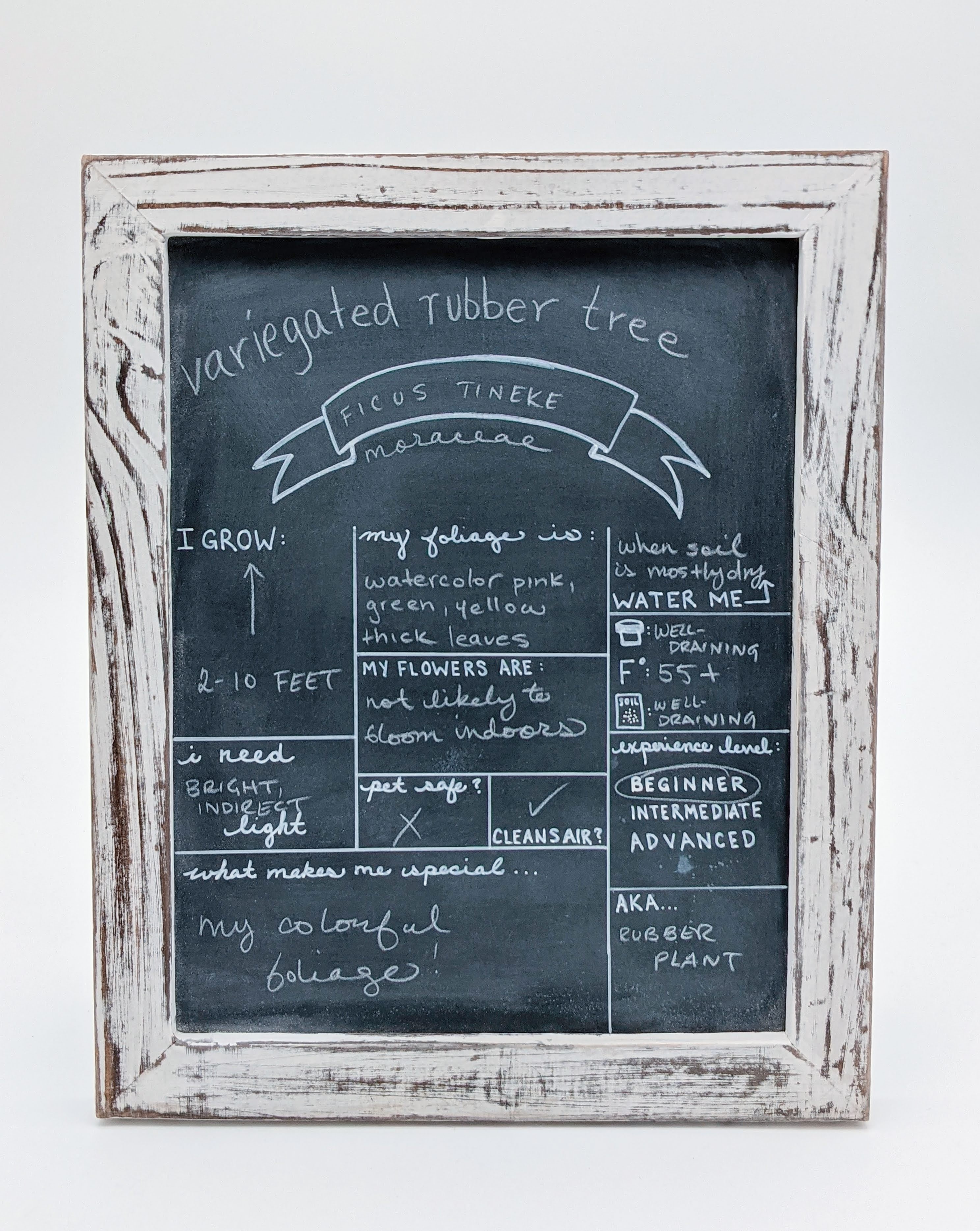 A relatively new plant to the scene, the variegated rubber tree, or Ficus Tineke, is making a “splash” with its colorful, watercolor-esque foliage! From the family Moraceae, this plant can grow to be around 2-10 feet tall when grown indoors depending on care and conditions. Its leaves are a pointed oval shape, but the real show is found in the colors of the foliage. The waxy, large, green leaves appear to have been splashed by pink, yellow, and white, and the colors extend even into the center vein of the leaves. These leaves can grow to be up to 12 inches long and 5 inches wide.